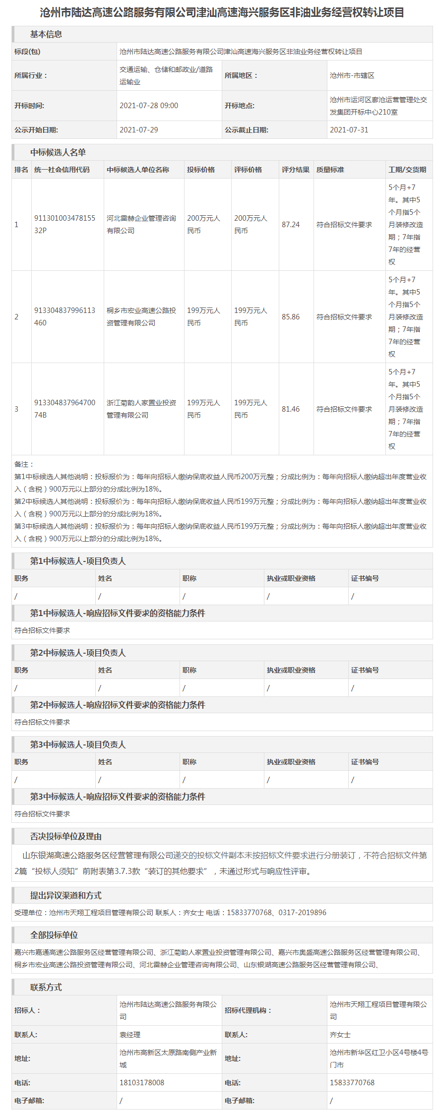 滄州市陸達(dá)高速公路服務(wù)有限公司津汕高速海興服務(wù)區(qū)非油業(yè)務(wù)經(jīng)營權(quán)轉(zhuǎn)讓項(xiàng)目中標(biāo)結(jié)果公示