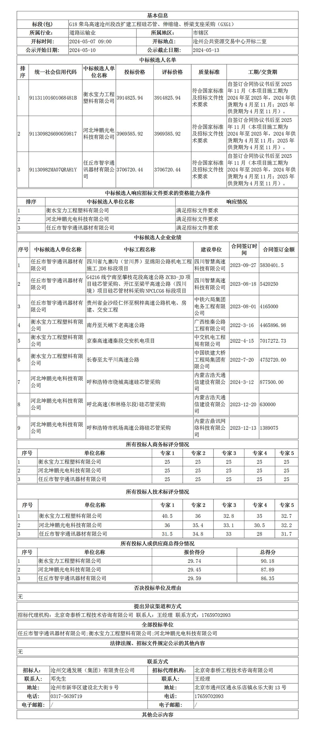 G18榮烏高速滄州段改擴建工程硅芯管、伸縮縫、橋梁支座采購(GXG1)中標候選人公示