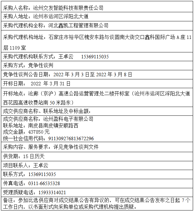 滄州高速公路稽查稽核系統(tǒng)設(shè)備采購(gòu)安裝項(xiàng)目 成交結(jié)果公告