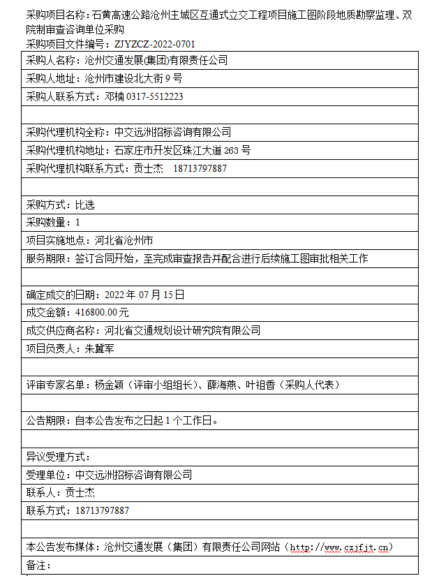 石黃高速公路滄州主城區(qū)互通式立交工程項目施工圖階段地質(zhì)勘察監(jiān)理、雙院制審查咨詢單位采購成交結(jié)果公告